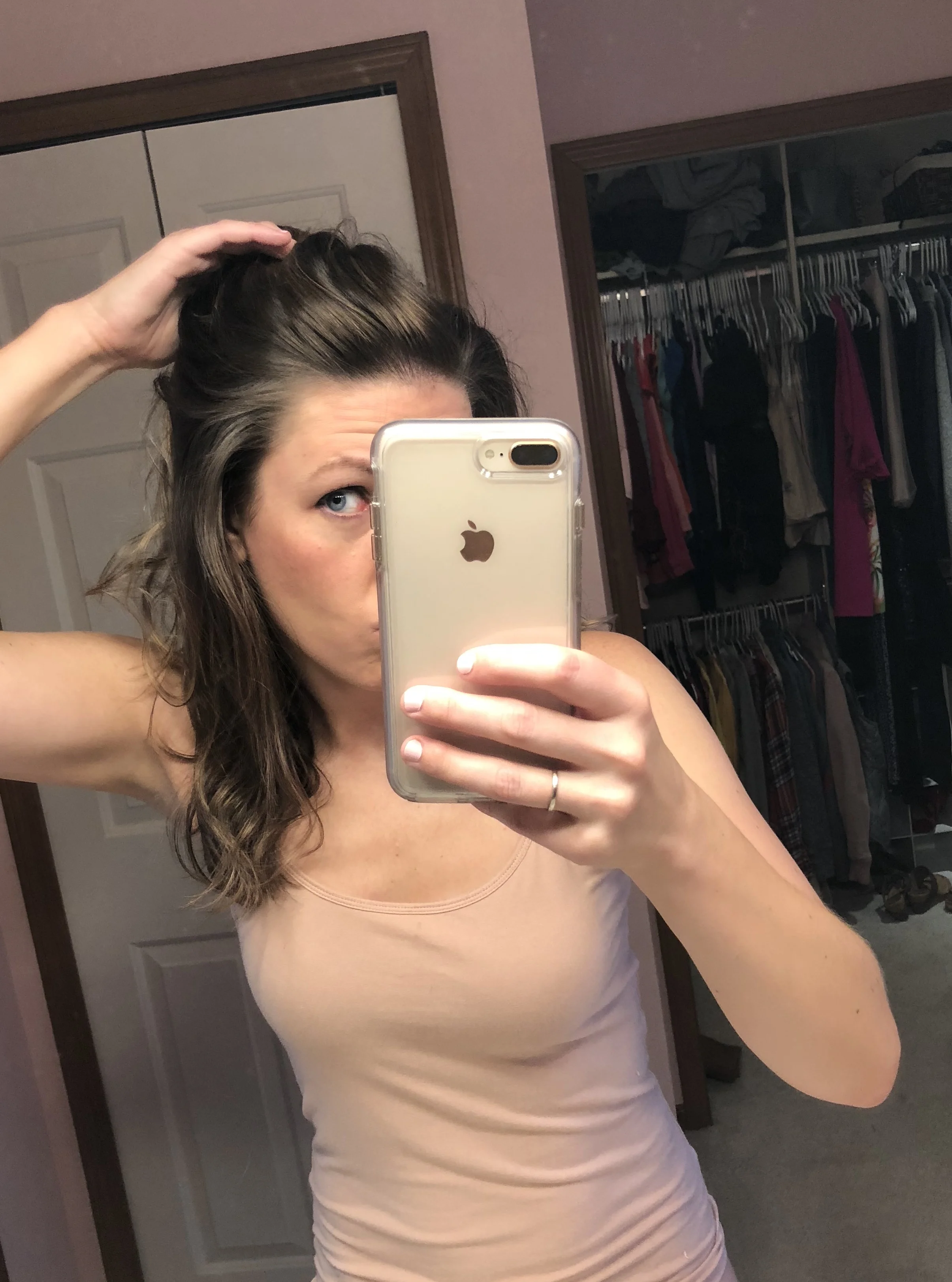 The photo below is a picture of me using it on a work day. You can see (kind of) that it sprays on white and powdery. You wait a minute or so, I do some of my makeup while I wait, and then you rub it around a little. That's it. Don't judge the pink walls. Our bedroom and bathroom is the last room to get our DIY makeover attention.